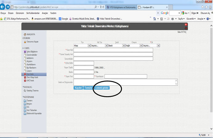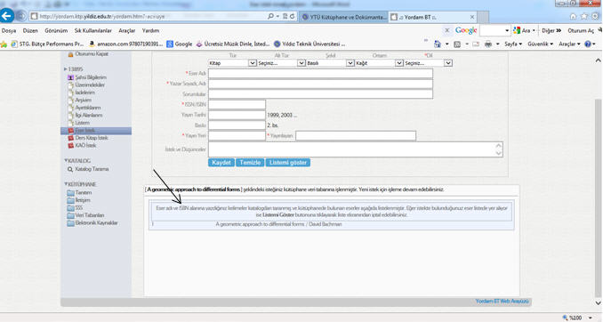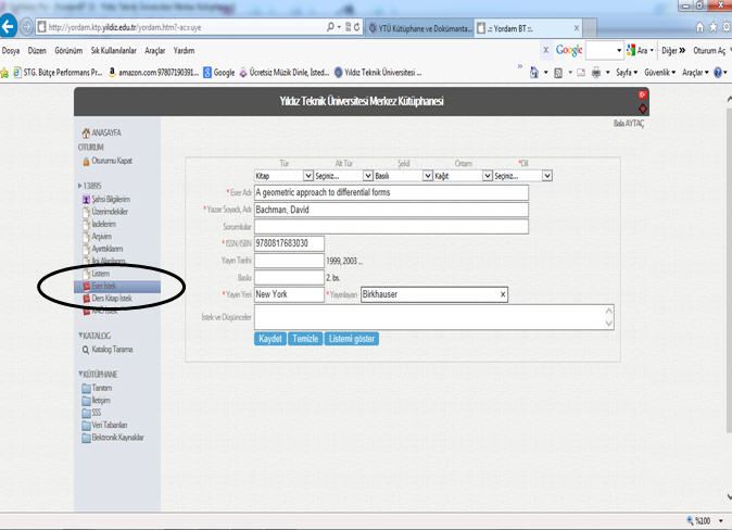 Açılan sayfanın sol menüsünde yer alan “ESER İSTEK” sekmesi seçilir. Gerekli bilgiler doldurularak “Kaydet” butonu tıklanır.
